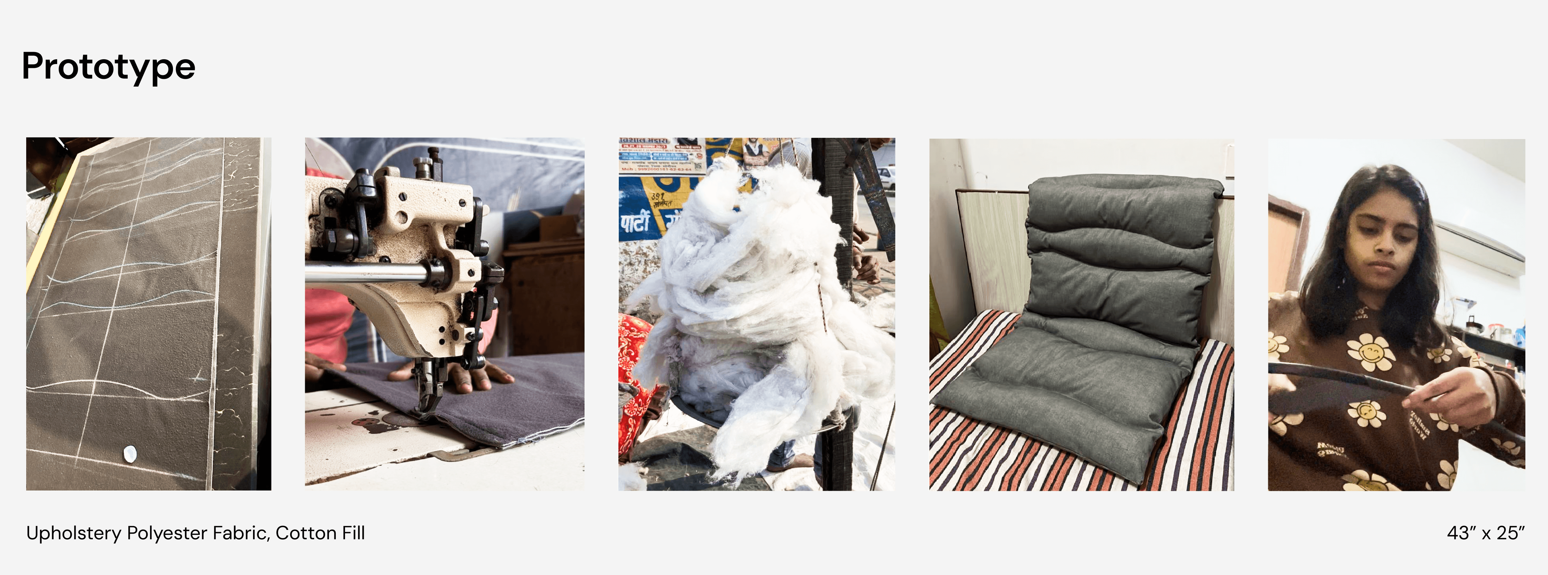 The prototype was crafted using velvet fabric (commonly used in sofa covers) for a soft feel, with cushioning filled with cotton, all stitched together for durability and comfort.