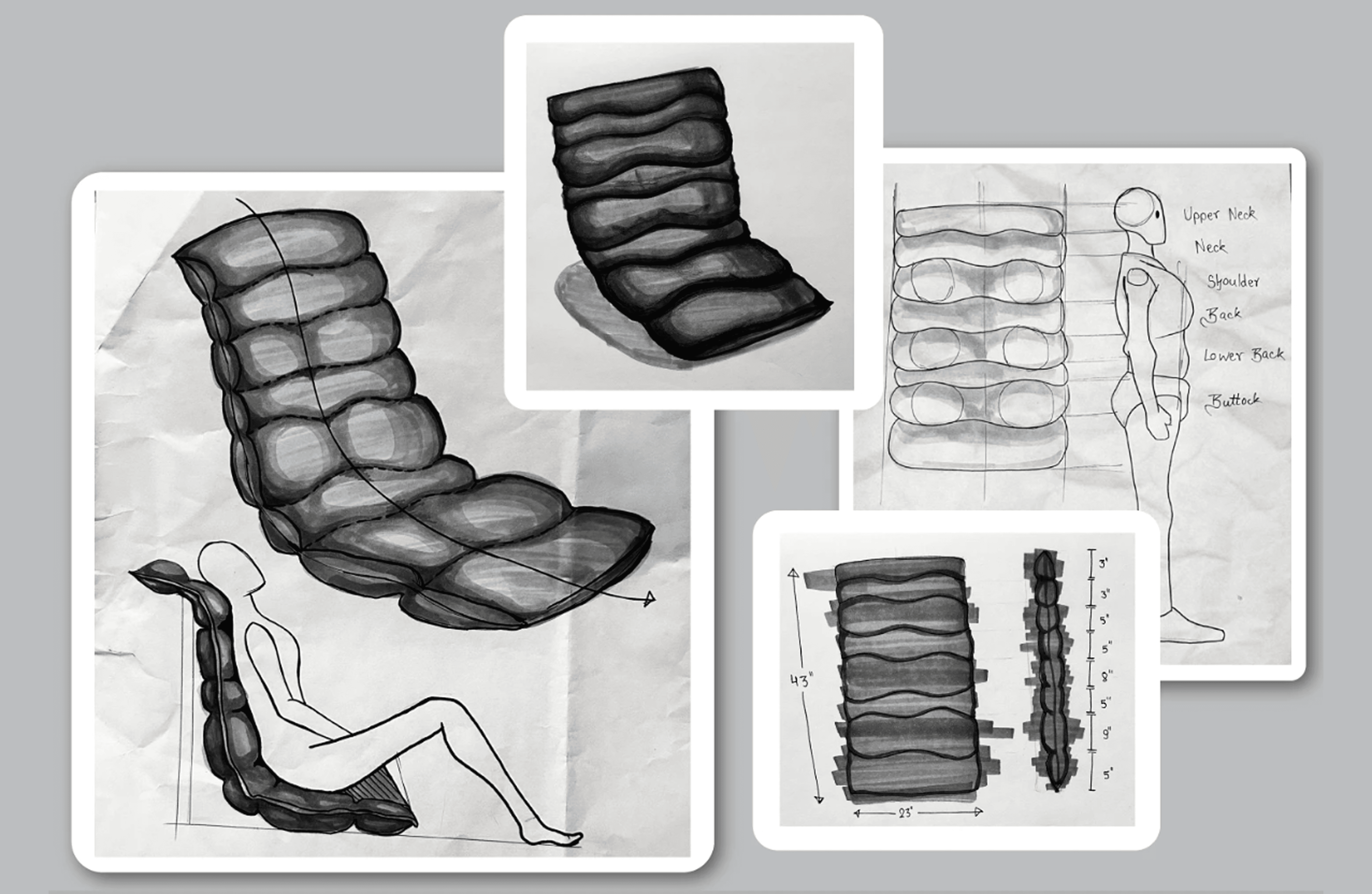 My biggest learning from this project was developing an understanding of ergonomics and how each curve directly impacts the body and overall comfort. I also realized that what we imagine on paper can be very different from what is actually manufactured. The process revealed challenges that are difficult to anticipate during the ideation stage. No product is perfected in a single attempt and it requires multiple iterations, especially when designing for comfort. Since comfort is a subjective experience, it demands extensive research, testing, and refinement to get it right.
